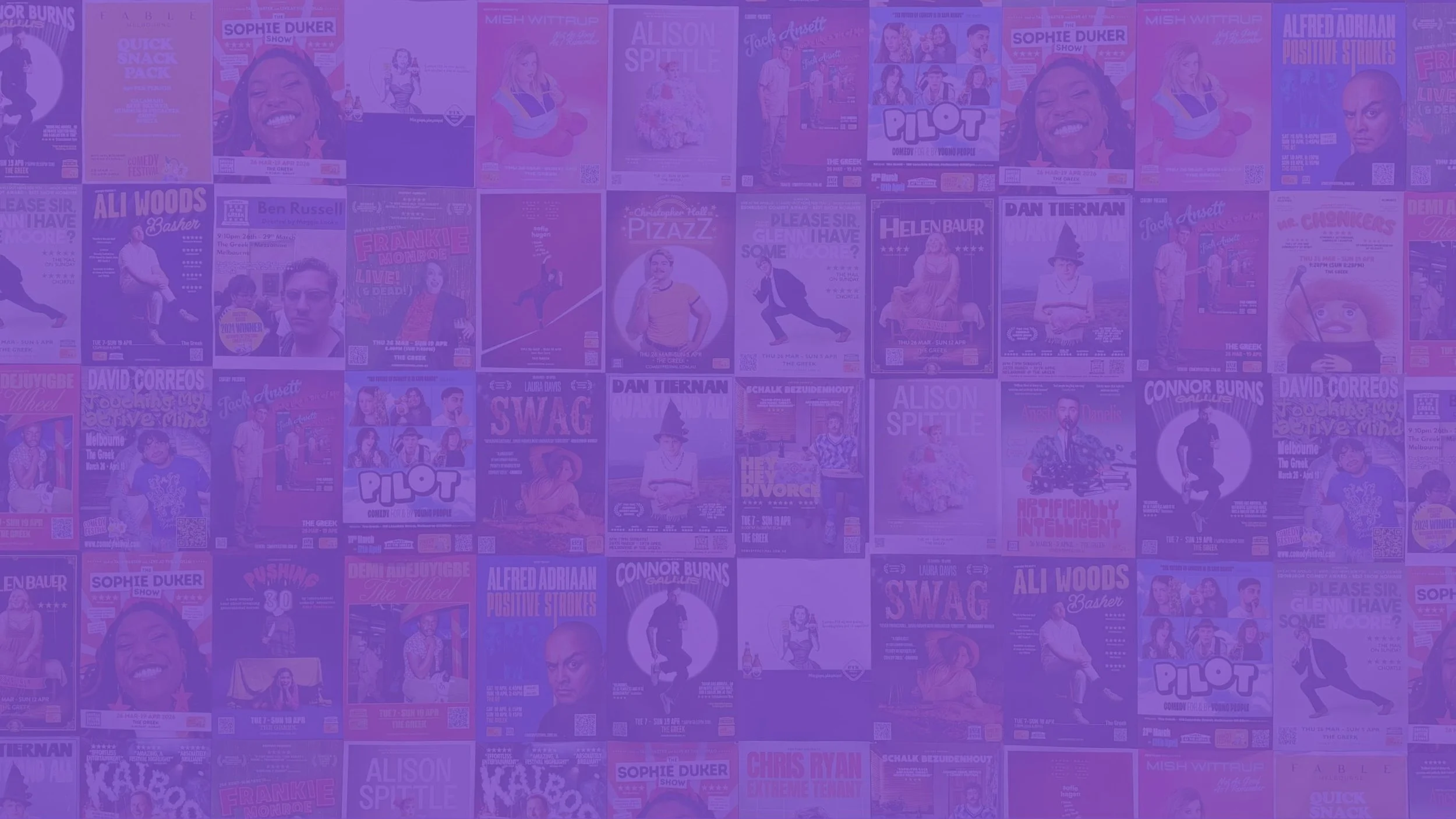 Catch a show at the greek Featured Mar 26 John Norris | Mr Chonkers Mar 26 Sofie Hagen | I Think Some of This is My Fault Mar 26 Ben Russell | Bon Mar 26 Helen Bauer | Bless Her Mar 26 Jack Ansett | Looks Like a Bit of Me! Mar 26 Mish Wittrup | Not As Good As I Remember Mar 26 Glenn Moore | Please Sir, Glenn I Have Some Moore? Mar 26 Christopher Hall | Pizazz Mar 26 Dan Tiernan | Quartz and All Mar 26 Sophie Duker | The Sophie Duker Show Mar 26 David Correos | Touching My Active Mind Mar 26 Joe Kent-Walters is Frankie Monroe: Live!!! (& Dead!!!) Mar 26 Ruby Teys | Ciao Latte Mar 26 Laura Davis | Swag Mar 26 Anesti Danelis | Artificially Intelligent Mar 27 Pilot Apr 7 Abby Govindan | Pushing 30 Apr 7 Chris Ryan | Extreme Tenant Apr 7 Ali Woods | Basher Apr 7 Demi Adejuyigbe | The Wheel Apr 7 Connor Burns | Gallus Apr 7 Schalk Bezuidenhout | Hey Hey Divorcé Apr 14 Alison Spittle | Big Apr 14 Kai Humphries | Kaibosh Apr 17 Croucher & Kindleysides | The Golden Twins Apr 18 Alfred Adriaan | Positive Strokes